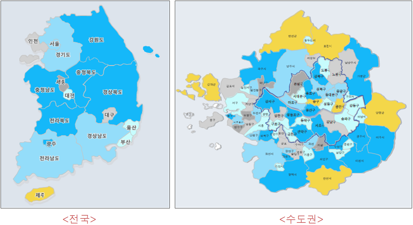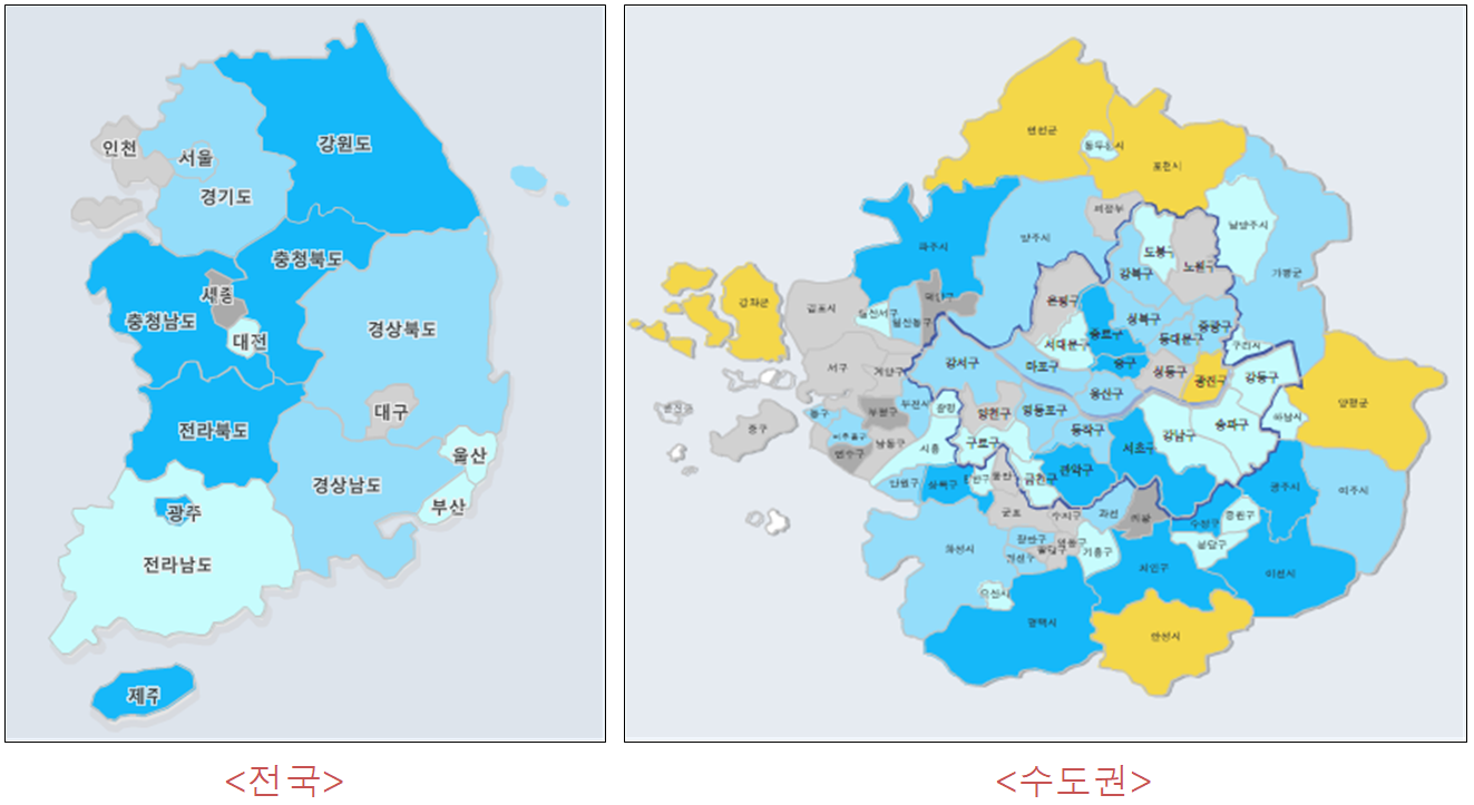 * 수도권 지도는 서울 등 지역별 색상 표현을 위해 작성된 지도로 실제 지도와 지역의 모양, 위치에 차이가 있을 수 있습니다.