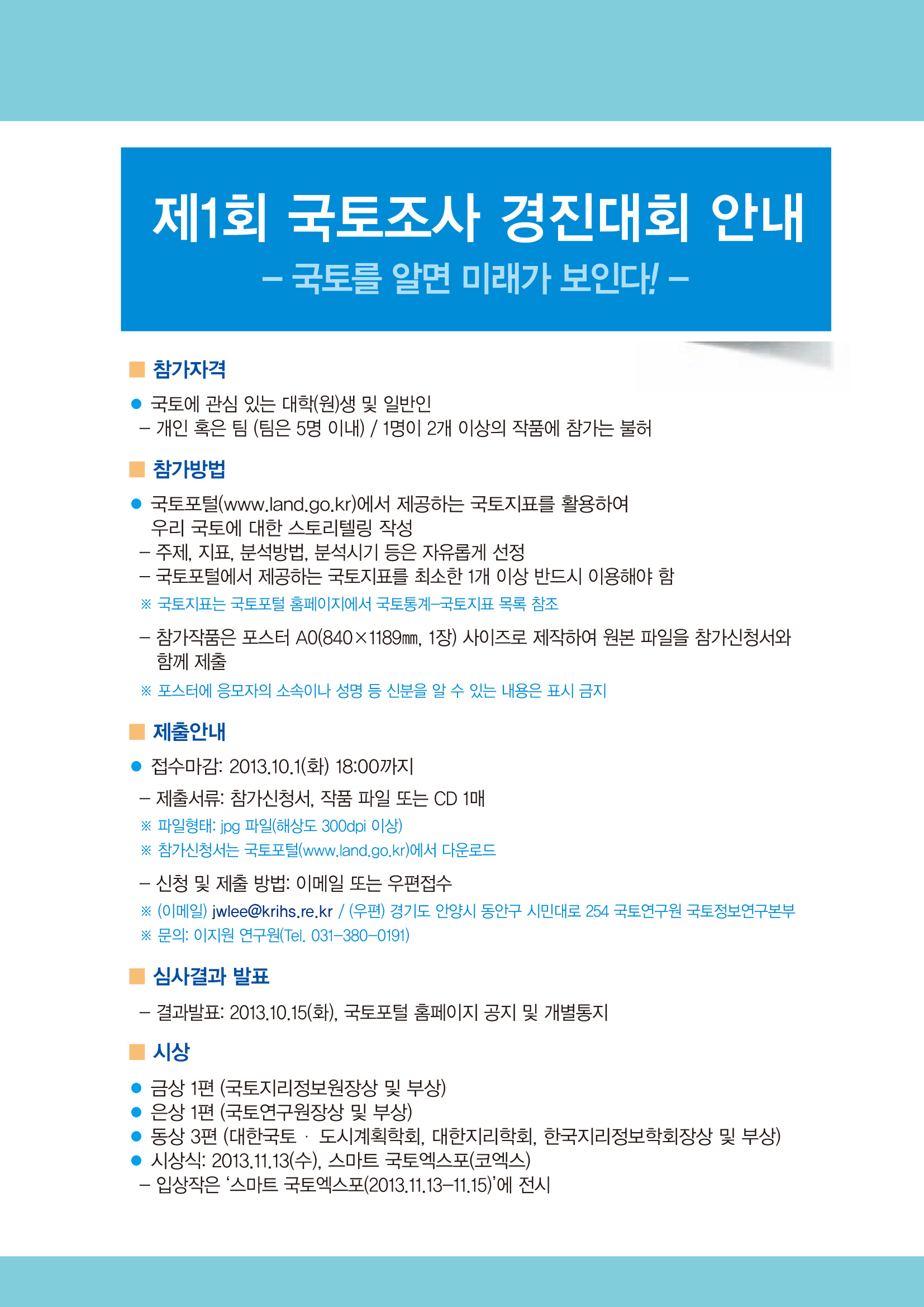 제1회 국토조사 경진대회 안내 작성일2013-09-30 조회수1,352 접수마감 날짜가 2013년 10월 15일(화)로 연장되었습니다. 많은 참여 부탁드립니다. 첨부파일 붙임자료1_안내.jpg (0Byte / 다운로드 164회) 다운로드 붙임자료2_참가신청서.hwp (0Byte / 다운로드 166회) 다운로드