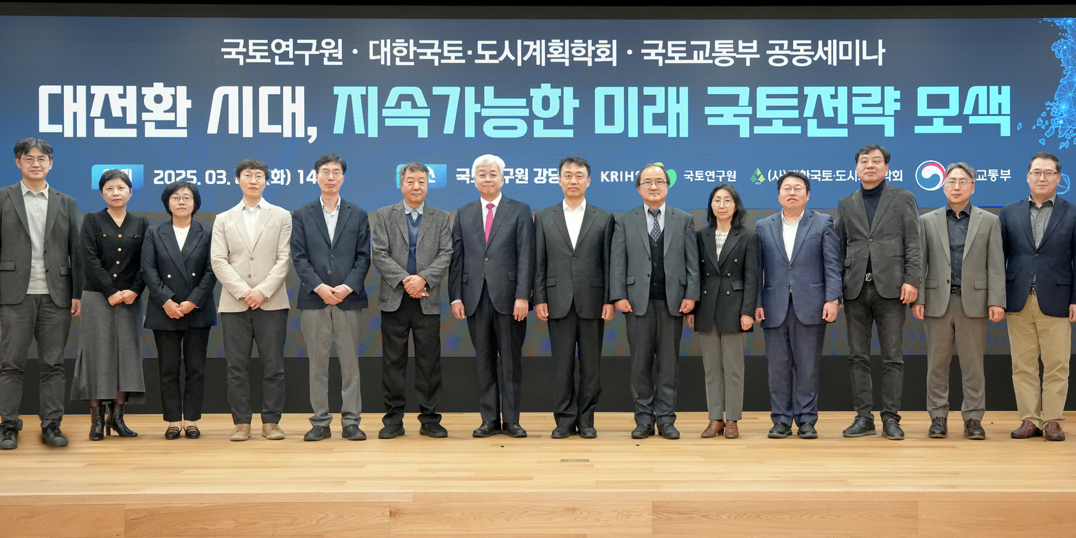 국토연구원(원장 심교언)은 대한국토・도시계획학회, 국토교통부와 함께 3월 25일(화) ‘대전환 시대 지속가능한 미래 국토전략 모색’을 주제로 공동세미나를 개최했다. 이번 세미나는 인구 감소와 지방소멸 위기, 극한기후 등 급변하고 있는 국토 여건 속에서 국토, 교통, 환경, 산업 등 분야의 주요 이슈를 논의하고 도로, 철도 등 주요 교통망 계획과 국가환경종합계획의 재수립 과정에서 각 분야 계획 간의 연계성을 높이기 위해 마련되었다.