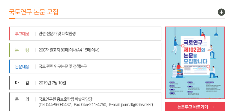 국토연구논문모집 국토연구 논문모집 게시판 이동 논문투고 바로가기 국토연구 논문모집 이미지